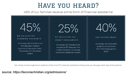 For example, Laconia Christian, which, according to this data receives the highest “EFA Amount”, has a tracker on their Admissions page sharing the percentage of students enrolled in their school using voucher funds.