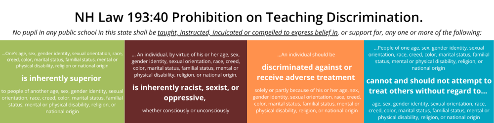 Another bill from Sen. Lang aims to clean up some vague language. SB 431 would amend the “divisive concepts” law (RSA 193:40) by clarifying that it is only a violation if teachers “intentionally or knowingly” teach one of the banned concepts, which deal with race, sexual orientation, and other identity topics. The law has been struck down by the courts because of its vagueness. While SB 431 only deals with the "intentionally and knowingly” change, many advocates have approached the hearings as a broader referendum on the law itself, highlighting the chilling effect it will have on teachers and the ways it will limit student learning.