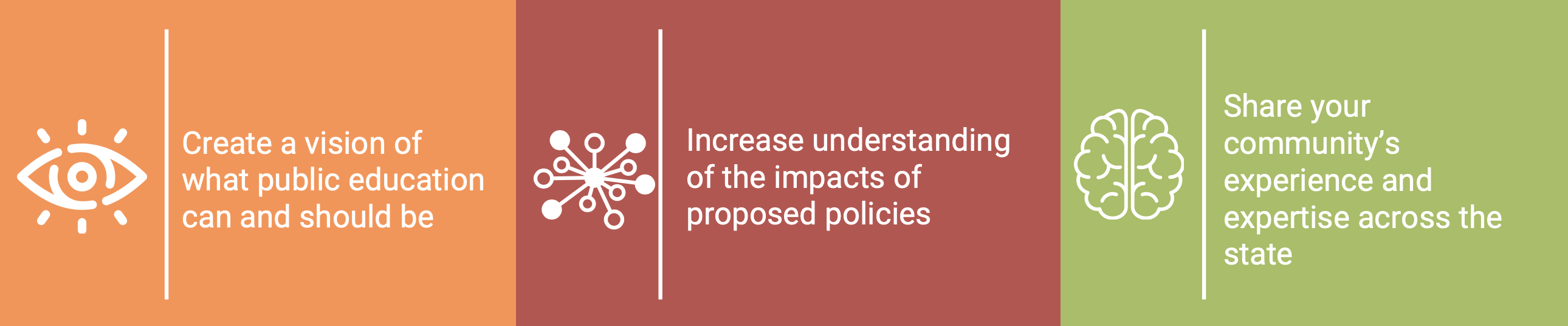 By defining the components and outcomes of a high quality public education, Reaching Higher will be better able to evaluate the impacts of proposed policies on our schools now and into the future. Our aim is to develop a broad framework that provides a lens for stakeholders to understand whether proposed legislation advances or impedes access to a high quality education. This framework will be based on community input and on research and evidence; and as ideas and evidence evolves, so will our framework.