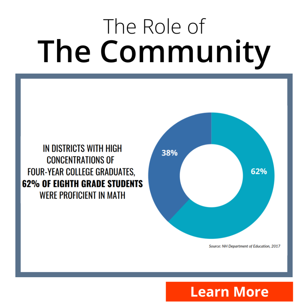 Reaching Higher NH is committed to understanding how family, community, and statewide factors impact learning and to explore how, given those factors and their influence, we can best support our students. There is considerable power in family and community factors on student outcomes in school, specifically a family’s income/economic status, and the overall educational attainment of a community in which the student lives. When students walk through their school door every day, they carry with them all their experiences – small and great: a nutritious breakfast, a sleepless night, a chronic illness, excitement over an after-school activity, anxiety over their family situation, and so much more.