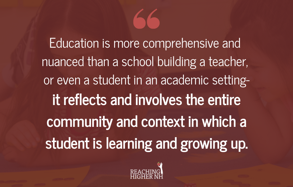The whole picture of public education in New Hampshire is complex – far more complex than the images conjured up when thinking of “education.” National headlines identify our state as one of the top K-12 educational systems in the country, yet these high-level data points tend to mask the nuances and experiences of students from different regions of the state. What we know is that context – both within buildings and within communities – matters deeply for student learning. This project looks beyond individual classrooms and schools to explore the family, community, and statewide factors that impact learning, and begins to explore how we can best support our students.