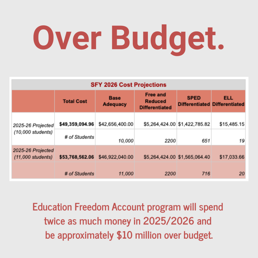 Beginning in the 2025/2026 school year, students using an Education Freedom Account (EFA) voucher receive at least $4,265.64, an amount equal to what the state believes covers the cost of an adequate education. In addition, students may receive additional funds if they are eligible for free or reduced lunch, if they are eligible for special education services, and/or if they are an English language learner. During the 2024/2025 school year, the average cost per student was $5,204.